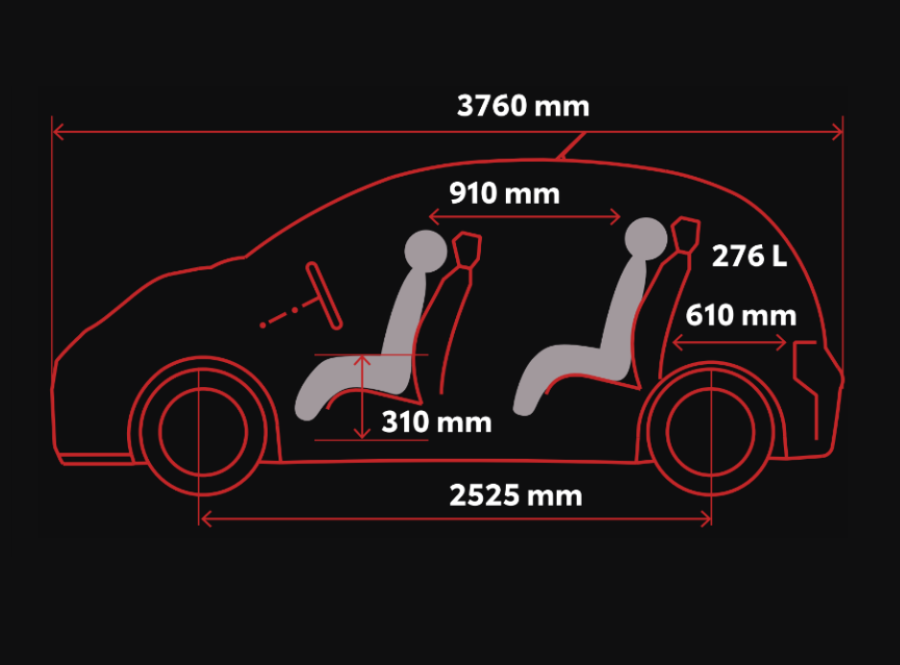 Không gian nội thất rộng nhất phân khúc với chiều dài cơ sở 2,525mm cùng khoảng cách giữa hai hàng ghế lên đến 910mm và thể tích khoang hành lý lên tới 261l, có thể tăng lên 276l khi bỏ tấm ngăn.